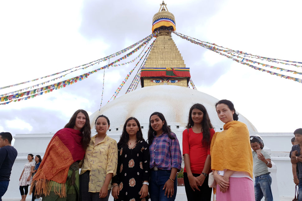 Baudanáth sztúpa előtt az iskolás lányokkal.