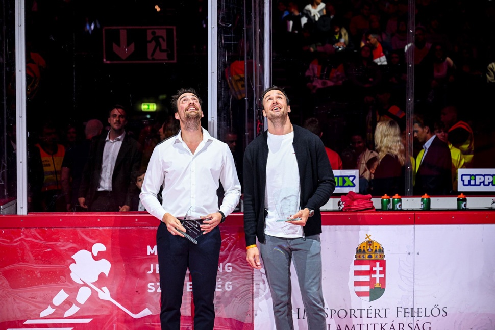 Járt a taps visszavonuló klasszisainknak is: jó volt újra együtt a jégen látni Kóger Dánielt, Magosi Bálintot, Nagy Gergőt, Pozsgai Tamást és Szirányi Bencét, még ha ezúttal civilben is voltak.