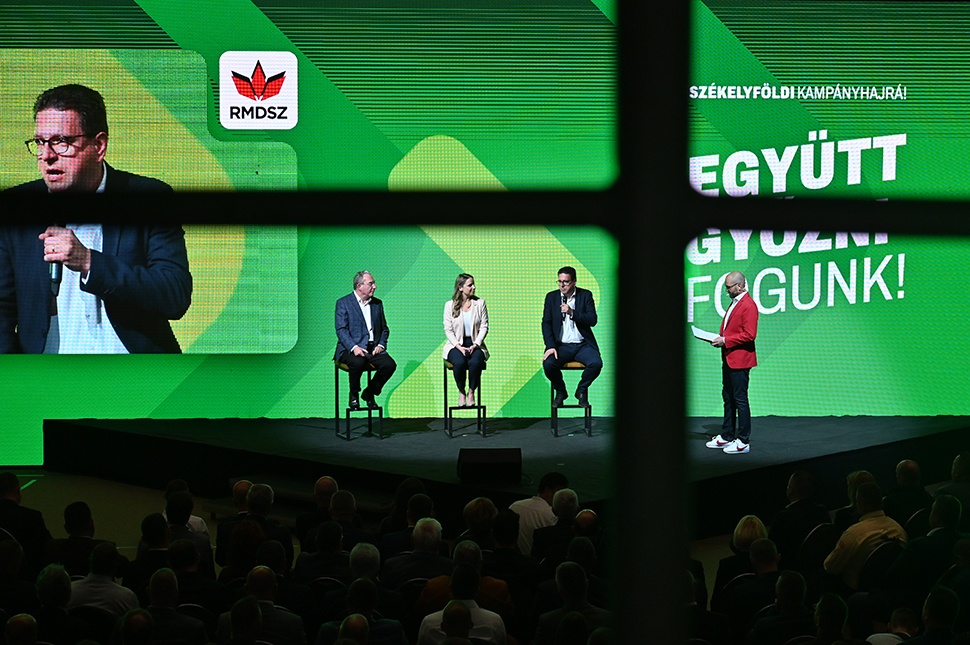Alig telt 10 percecskébe bejutni a csarnokba, ahol a lelátóval szembefordítva állt a színpad, előtte már nagyjából elfoglalták a székeket, a tribünön is elszórtan voltak csak helyek. Miért voltak ennyien? Mivel nem csak Hargita, Kovászna és Maros megye RMDSZ-es politikusai, hanem Brassó, Fehér, Szeben és Beszterce-Naszód megye önkormányzati vezetői is eljöttek a kampányindítóra.