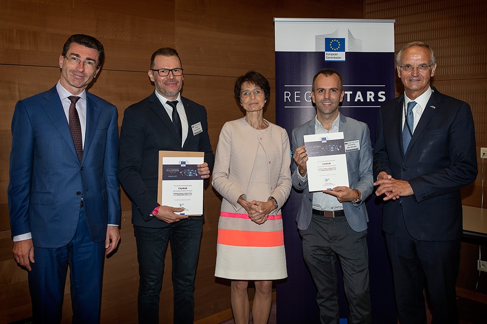 Marc Lemaître, az Európai Bizottság regionális és várospolitikáért felelős főigazgatóságának (DG REGIO) főigazgatója, Kézy Béla, Eloy Gomez Giron a City Walk projekt képviselői, köztük Marianne Thyssen, a foglalkoztatásért, a szociális ügyekért, valamint a munkavállalói készségekért és mobilitásért felelős európai biztos és Lambert van Nistelrooij volt EP-képviselő. A fotót a rendezvényszervezők küldték.