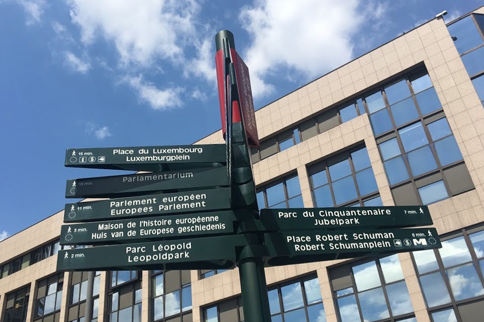 Brüsszeli útjelző táblák egy kereszteződésben, írja rajtuk hány perc alatt érünk el gyalog úticélunkhoz és ikonokkal jelzik, mit találunk ott