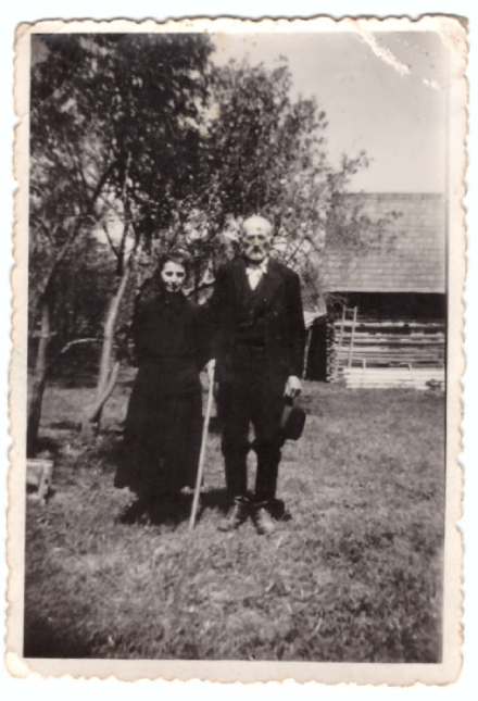 Derzsy Domokos szülei (Derzsy Péter és Kerekes Zsuzsanna) felsőboldogfalvi házuk udvarán. A fotó édesapja halála előtt alig két hónappal, 1944. aug. 20-án készült [Hegyi Kálmánné Derzsy Ildikó családi fotógyűjteménye, készítője ismeretlen