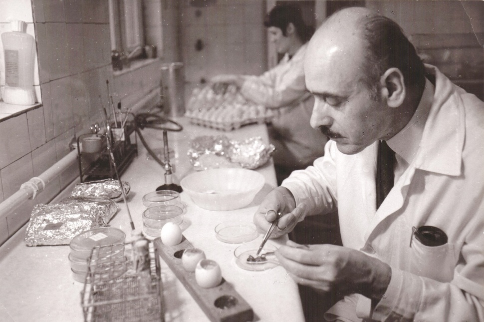 Derzsy doktor az Állategészségügyi Kutatóintézet laborjában asszisztensével, Vörös Gábornéval ['70-es évek, a Magyar Távirati Iroda felvétele].