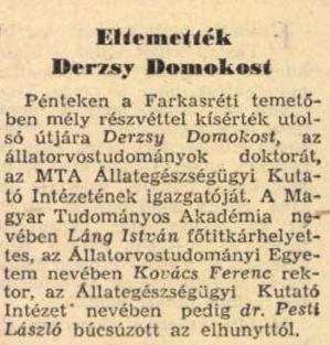 Derzsy Domokos temetésének híre, illetve családjának köszönetnyilvánítása a Népszabadság 1975. augusztus 16-i (szombati) lapszámában.
