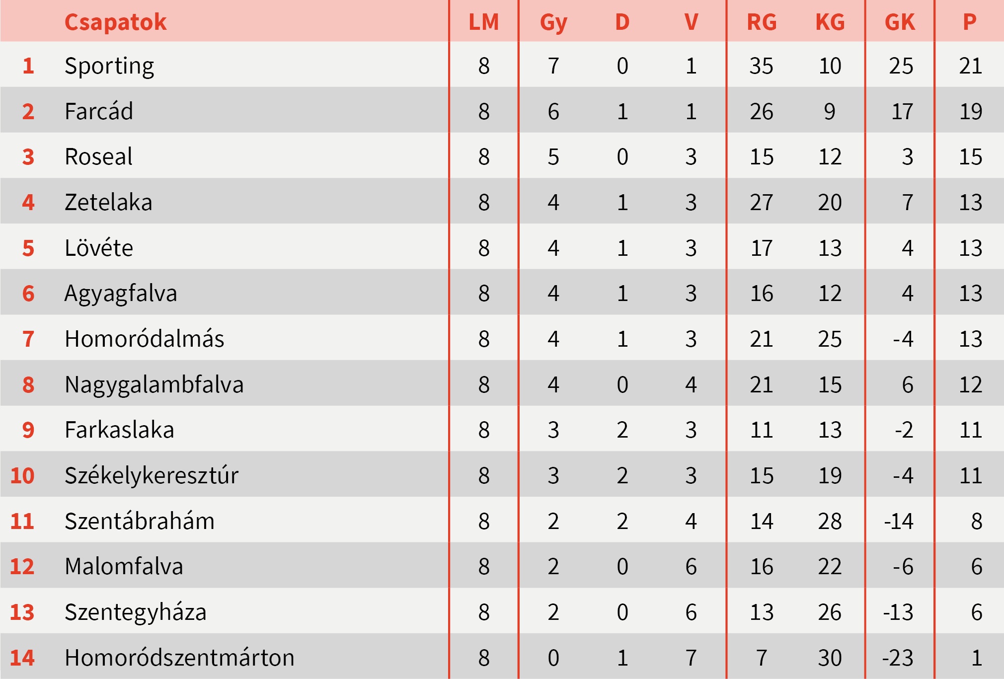 A nyolcadik fordulóban a Farcád-Székelyudvarhelyi Sporting találkozó végeredményére voltak kíváncsiak az Udvarhely körzeti labdarúgó-bajnokságot követők. A hazai csapat 2-1-re győzte le az udvarhelyieket, két pontra közelítették meg az eddig százszázalékosan teljesítő udvarhelyieket a bajnoki tabella élén. A harmadik helyen továbbra is a Székelyudvarhelyi Roseal áll. Meglepetésre, hétvégén kikaptak Szentábrahámon, de helyezésüket így sem veszítették el.