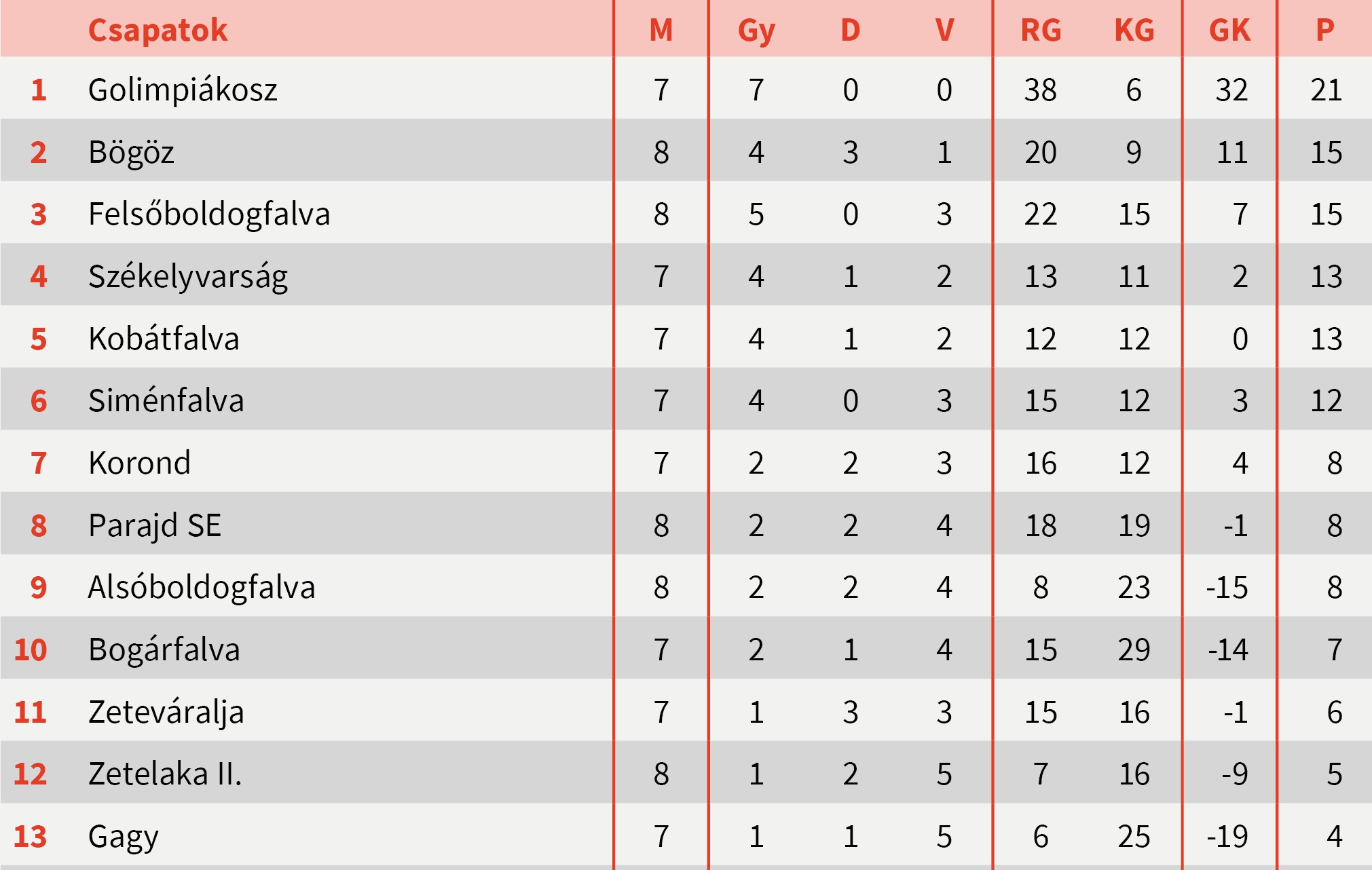 Az 5. Ligában továbbra is magabiztosan vezet a Székelyudvarhelyi Golimpiákosz, ebben a csoportban a második és harmadik helyekért folytatódhat a harc. Ezeken jelenleg Bögöz és Siménfalva szerepel. Előbbiek egy ponttal lettek gazdagabbak a nyolcadik fordulót követően, míg Siménfalva szabadnaposként őrizhette meg harmadik pozícióját. Felsőboldogfalva és Székelyvarság csak a gyengébb gólkülönbség miatt maradt le a dobogóról.