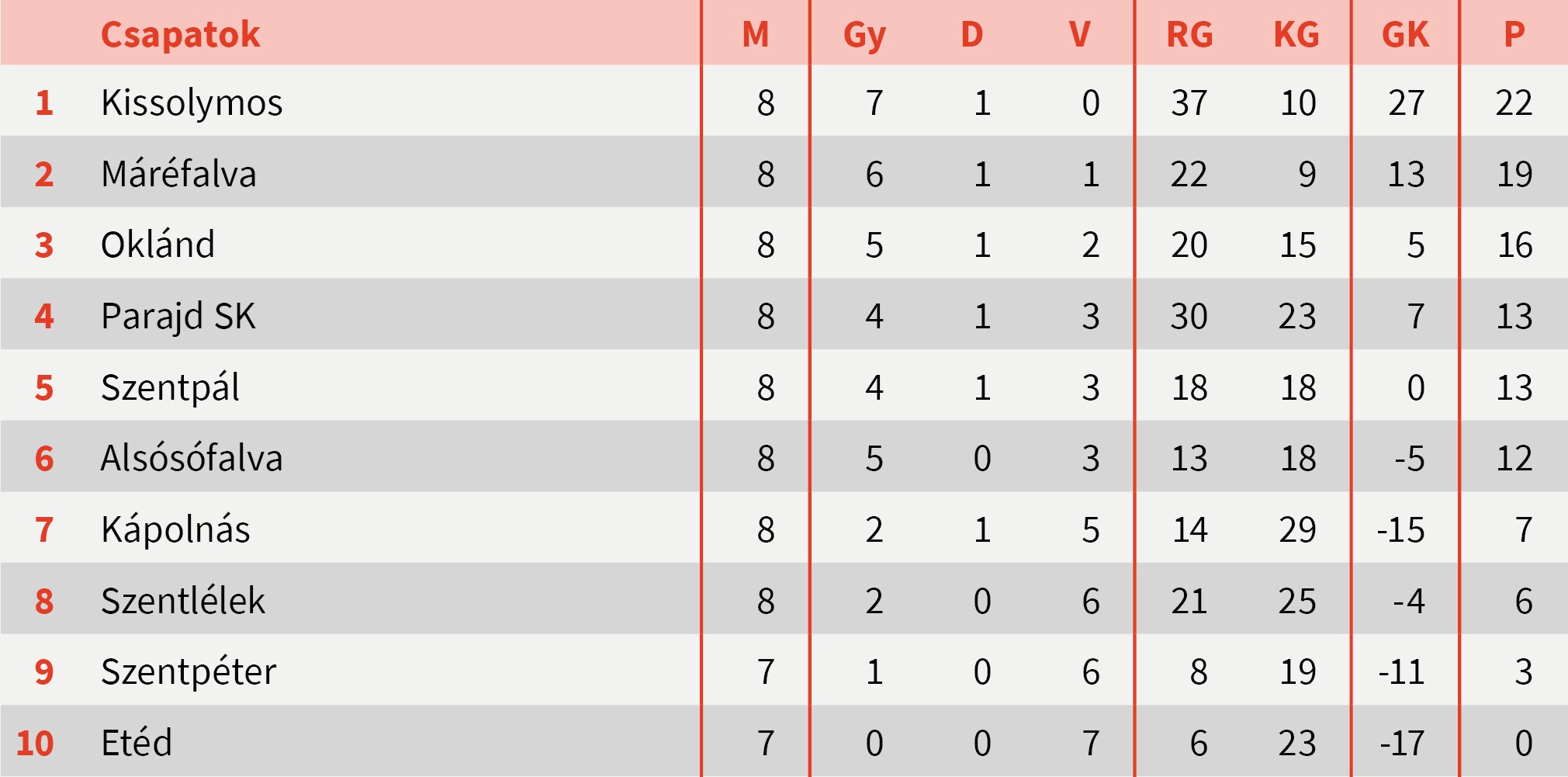 A 6. Ligában is folytatódik a verseny Kissolymos és Máréfalva közt az első helyért. A kissolymosiak vannak hárompontos előnyben, ezt az előnyt a nyolcadik fordulóban is megtartották. A harmadik helyet Oklánd vette át a Parajd SK-tól.