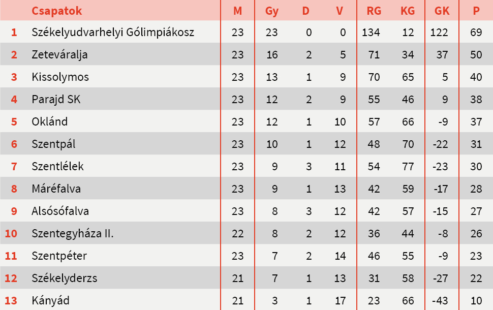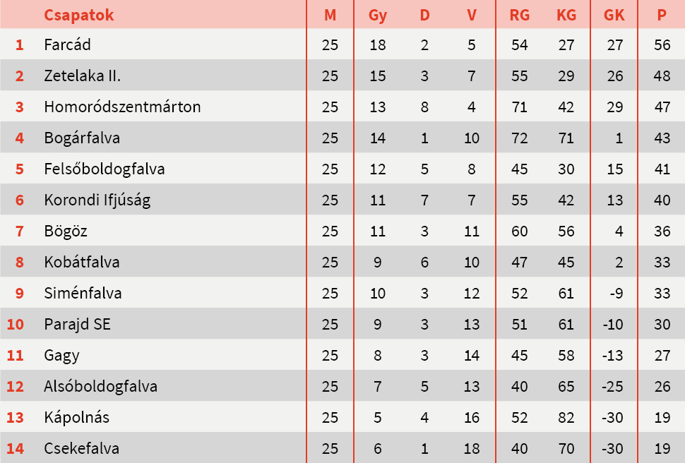 Egy fordulóval a bajnokság befejezése előtt az is eldőlt, hogy melyik két csapat végez a dobogón. Zetelaka II. és Homoródszentmárton állnak a második, illetve harmadik helyen. A zetelakiak előnye mindössze egy pont, és az utolsó fordulóban egymás ellen játszik a két együttes.
