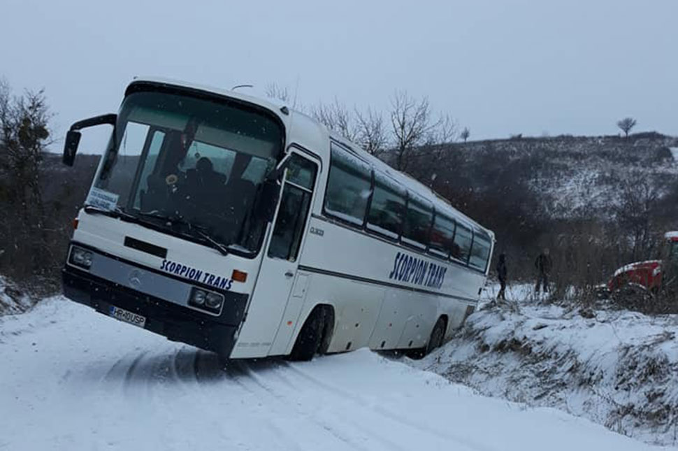 A Scorpion Trans különjáratának a hátsó fele lecsúszott az útról egy kanyarban, és fennakadt – tudtuk meg a cég képviselőjétől. Senkinek nem esett baja, a busz azóta úton van utasaival Parajd fele. A járműn téli gumik voltak, de az út nem volt letakarítva, havas és jeges volt, borzasztóan csúszott, befarolt a sáncba, de azóta kisegítették onnan – közölte portálunkkal Sándor Tamás ügyvezető.