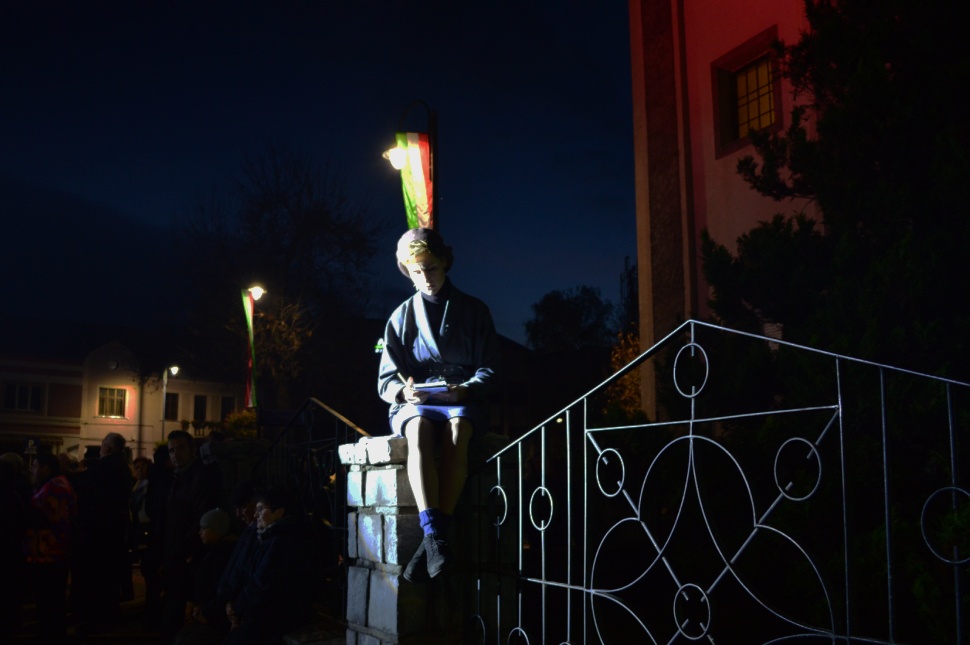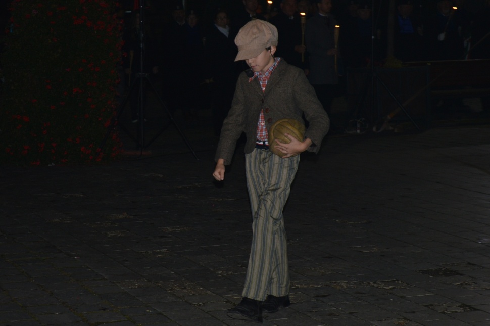 – egy kisfiú kétségbeesett hangja ránt vissza minket a valóságba. Talán elvesztette szüleit? – fordul mindenki az irányába. A hang egyre csak erősödik, mire egy korabeli öltözéket viselő kisfiú áll ki a tömeg elé, a Márton Áron térre.