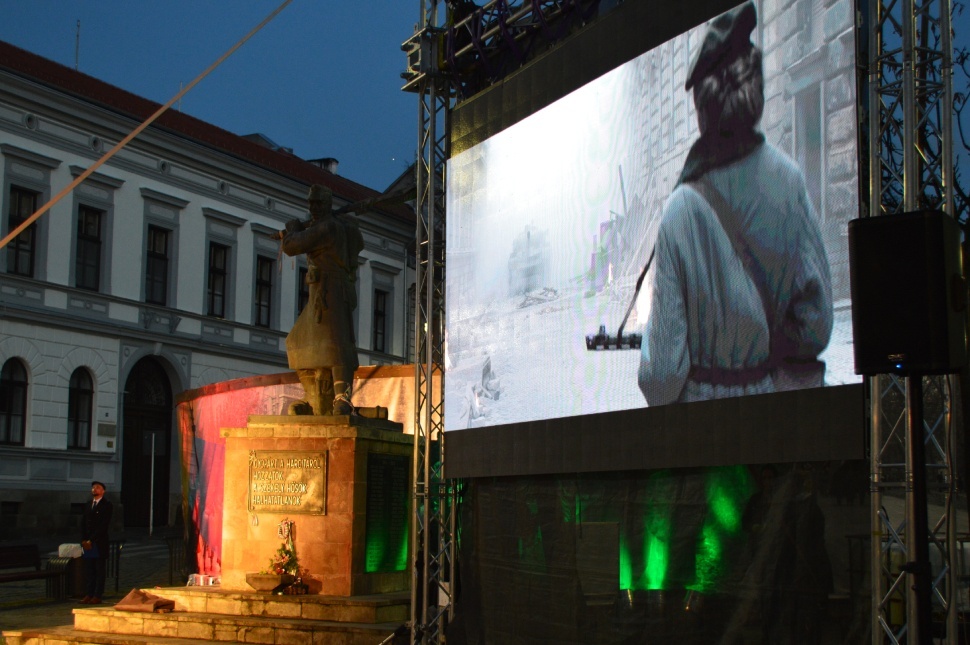 Sem zene-, sem énekszó nem hallatszik, gyászos tömegként vonulunk végig a Kossuth utcán, a Márton Áron térig, ahol kivetítőn elevenednek meg előttünk a forradalom pillanatai, magyarországi színészek játékában.
