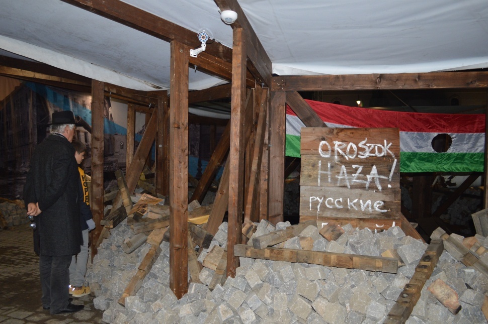 Gyerekek fogócskáznak szombaton este, a Márton Áron téren felállított Barikád a szabadságért című szabadtéri tárlat körül, s talán nem is sejtik, hogy valami készül odabent. Vászonlepel takarja el a tárlat bejáratát, az apró réseken mégis belátni: „Oroszok haza!” – írja a barikád tetején, s csak másnap, október 23-án látjuk, mi is van mögötte.