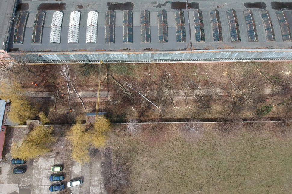 Mire pénteken újra a helyszínre értem, alig két nap elteltével már nyoma se volt az út felőli két fasornak, és a főbejáratnál is az utolsókat vágták. A legtöbbet harminc-negyven éve ültették, a gyár tervezőosztálya és a technikumos praktikázók, saját kezükkel. Most oda lett mind, már csak történelem, akárcsak ez az utolsó kép.