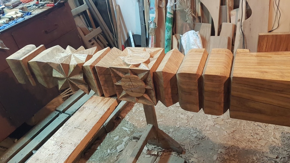 – Csernátonban Haszmann Pali bácsi gyűjtött a környékről kopjafákat, egyik látogatásunk alkalmával mesélt a díszítőelemek jelentéséről. Én is vásároltam egy könyvet, amiben részletesen taglalják ezt: a tulipánforma a nőt, a buzogány a férfit jeleníti meg, kiemelkedő elme esetében lángot, könyvet használunk, látható az elhunyt életkora a kopjafán, de még az utódokról is kaphatunk információkat – cserefából, a garázsban, megfelelő muzsika mellett készülnek a darabok Csaba műhelyében.