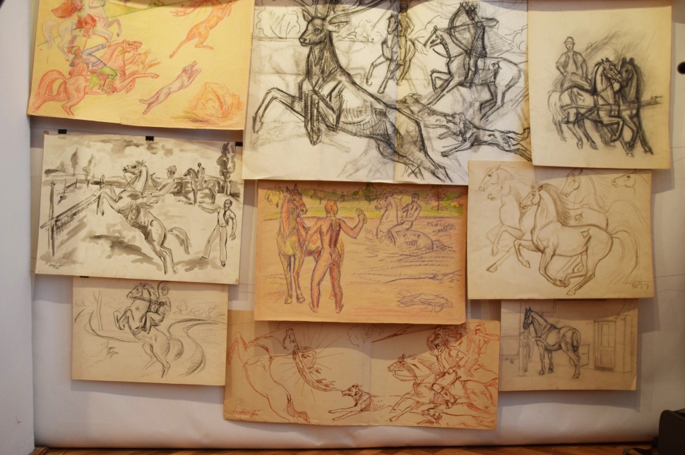 Egy egész emberélet jelenik meg előttünk a lóábrázolásain végignézve: fiatal, száguldó csikó rajza, közvetlen mellette egy, szilajul birkózó lovakat ábrázoló munka, csikós tereli a lovakat, ám részben még mindig szabadok. Mintha a gyermekkor és a fiatalság gondtalan éveit látnánk. Aztán a kemény munkával eltöltött évek következnek: nehéz szekeret húzó, favontatásba befeszülő lovakat ábrázoló rajzok előtt állunk, s végül elérkezünk az élet utolsó korszakához, egy meggyötört, megfáradt ló képéhez.