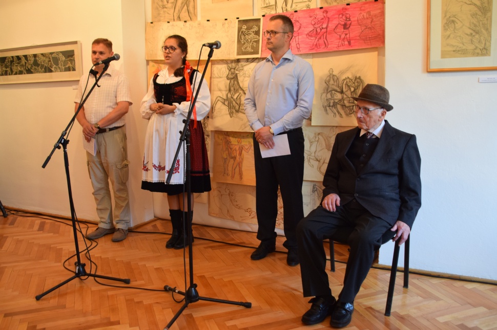 A belső kiállítóteremben ezekből láthatunk kiállítva néhányat, így a lófürösztést, a csodaszarvas mondát, a székely táncoló párt, de néhány vonalban megrajzolt vagy igényesen kidolgozott női aktok is helyet kaptak a falon, magyarázta a művészettörténész, majd Gyuri bácsinak adta át a szót, aki felállva, a közönség felé fordulva köszönetet szeretett volna mondani: