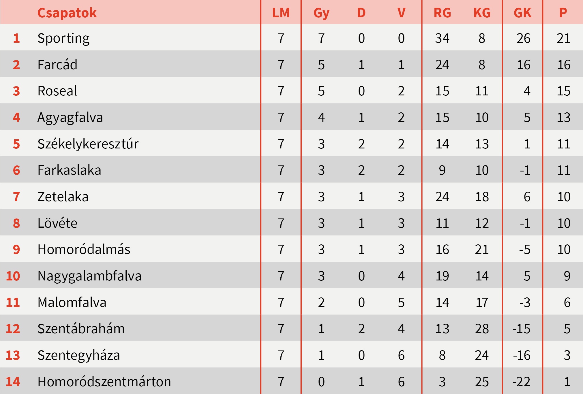 Nem változott a hetedik forduló után sem: Székelyudvarhelyi Sporting, Farcád, Székelyudvarhelyi Roseal a sorrend a labdarúgó 4. Liga bajnoki tabelláján. Mindhárom együttes hozta a kötelezőt hétvégén. Agyagfalva egy helyet javított, és a negyedik helyre jött fel Lövéte legyőzését követően, a keresztúriak négy helyet javítva az ötödikek.