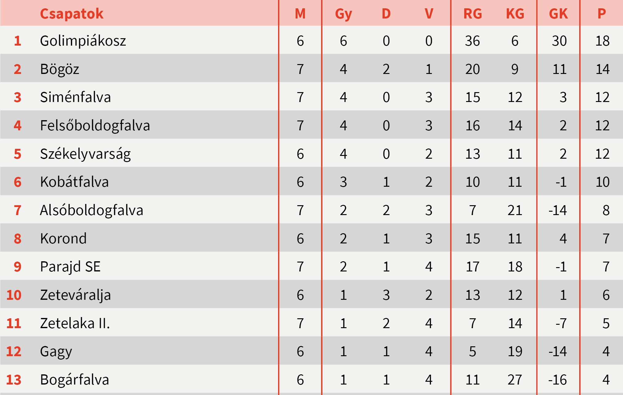 Az 5. Liga első helyét kibérelte a Székelyudvarhelyi Golimpiákosz, akárcsak a tavalyi idényben a 6. Liga folytonos elsőségét. Bögöz egy pontot szerzett az elmúlt fordulóban, de a második helyezése nem került veszélybe. A leglátványosabb Siménfalva helyezése a múlt heti táblázathoz képest. A hatodik helyről a harmadikra lőtték magukat a varságiak legyőzésével.