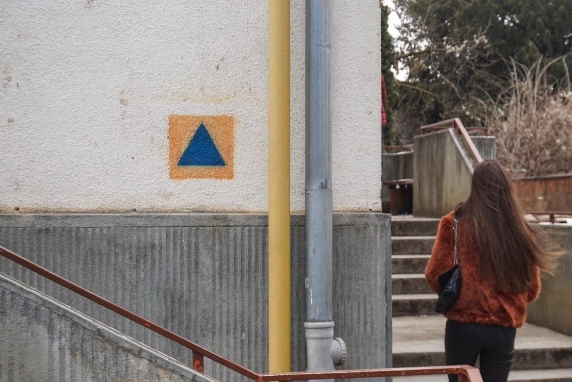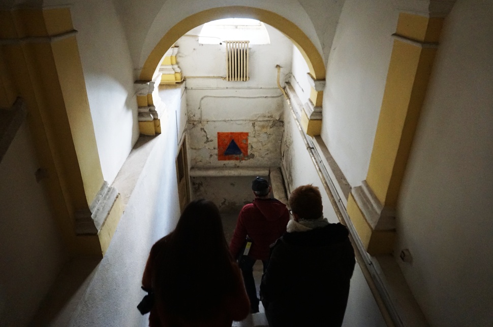A narancssárga alapon kék háromszög jelzés már ismerős, messziről kiszúrjuk. Az épület lépcsőin felmenve a második bejáratnál kell betérni balra, és rögtön szemben találjuk az óvóhelyet, melynek egyezményes jele az ajtóra is ki van ragasztva. Felette a helyiség jelenlegi rendeltetése: levéltár és könyvtár.