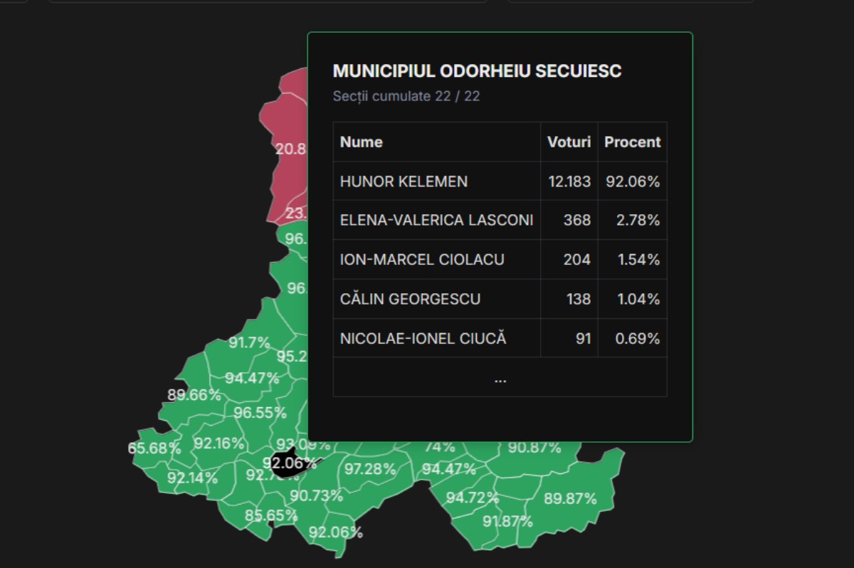 A második helyezett Maroshévíz, Bélbor és Salamás kivételével, ahol Ciolacu is tényező volt, George Simion lett. Minden román többségű önkormányzat esetében két jelölt szavazatszáma meghaladja a 40 százalékot, Gyergyóhollón az 55 százalékot is. A Roaep statisztikájában csak az első hat jelölt szavazatszámai látszanak, de szinte nincs olyan település Hargita megyében, ahol legalább 10 embernek ne lett volna TikTokja, és ne tetszett volna meg a választóknak a rendszerellenes meglepetésgyáros, Călin Georgescu.