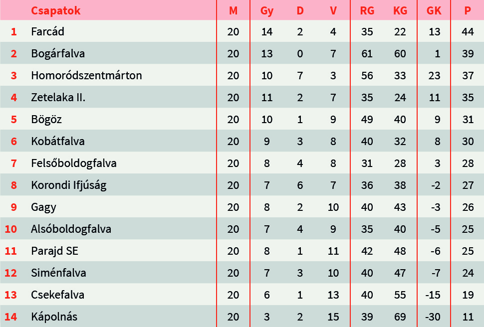 Az 5. Liga udvarhelyi csoportját Farcád vezeti. Az elmúlt fordulóban is hozták a kötelezőt, hazai pályán 2-0-ra győzték le Gagy csapatát. Bogárfalva kihasználta a homoródszentmártoniak botlását, és a Parajd SE elleni győzelmének köszönhetően feljött a második helyre. Homoródszentmárton átvette a bogárfalviak eddigi pozícióját.