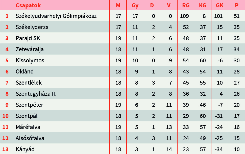 A csoport második és harmadik helyén Székelyderzs és a Parajd SK található. A derzsiek jobb gólarányuknak köszönhetik a jelenlegi második helyet.