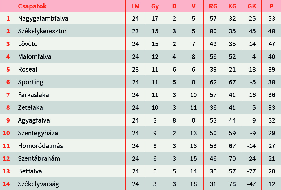 Az már biztos, hogy Nagygalambfalva, Székelykeresztúr és Lövéte végez a labdarúgó 4. Liga nyugati csoportjának a dobogós helyein. A végső sorrendre azonban várni kell még két fordulót. Hétvégén fontos pontokat veszítettek a jelenlegi listavezető galambfalviak. Előnyük továbbra is öt pont Keresztúrral szemben, de a második helyezett egy találkozóval kevesebbet játszott.