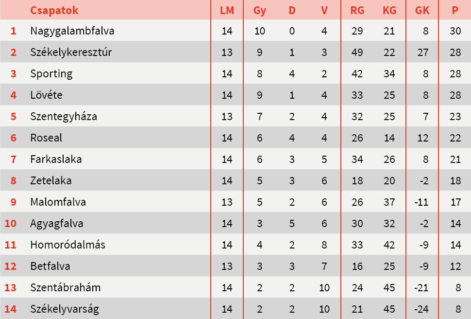 Ezt a pozíciót vasárnap szerezhetik vissza a címvédő keresztúriak. Ugyanis délután három órakor épp a nagygalambfalviakat fogadják hazai pályán. De az is megtörténhet, hogy a vendégek megerősítik jelenlegi helyüket. Amennyiben a két együttes döntetlent játszik, úgy a Sporting vagy Lövéte is átveheti a vezetést. Ehhez azonban mindkét együttesnek meg kell szereznie a pontokat. A Sporting az agyagfalviak otthonába látogat, Lövéte a szentábrahámiak vendége lesz.