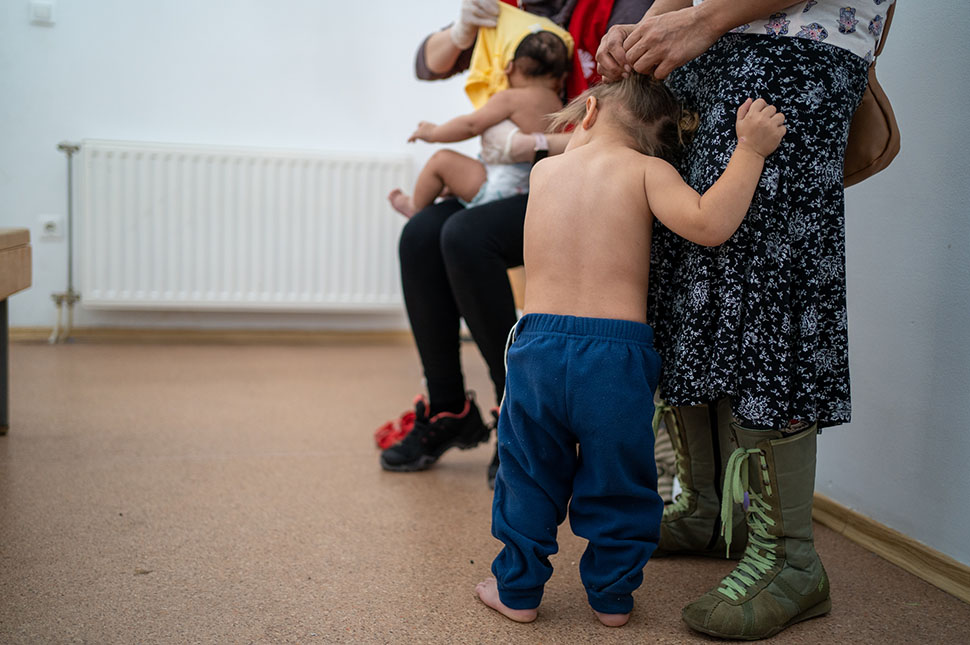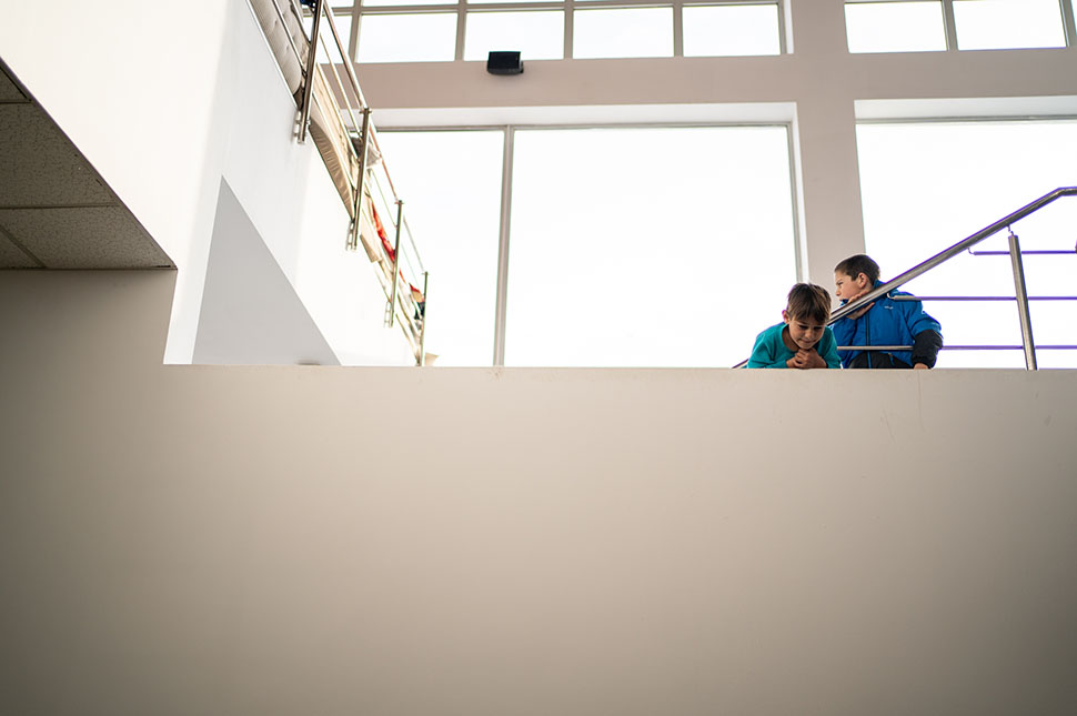 Alig fejezzük be az alpolgármester asszonnyal a beszélgetést, elcsípünk egy piros blúzos önkéntest babakáddal a kezében, utána osonunk. A hosszú folyosón gyerekek szaladgálnak egy labda után, őket kerülgetjük közben, míg meg nem érkezünk egy kifűtött öltözőbe: a padokon pelenkák és babaruhák hevernek, három anyuka vetkőzteti gyerekét, az önkéntesek pedig a vizet készítik elő.