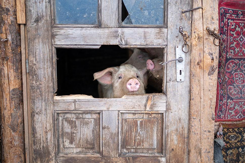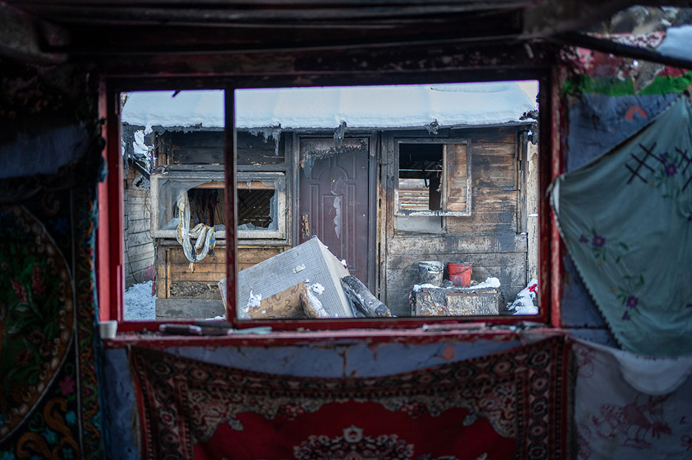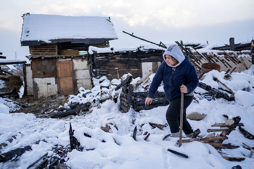 Bár az ő házuk leégett, egy másikba költöztek, akinek a gazdája már nem lakik itt, a kormos fával fűtenek, élelmet pedig kapnak – így élnek a tűz óta. Az itt maradt állatokat ők gondozzák, büszkén mutogatja nekünk a disznókat a bal oldali sor legvégén.