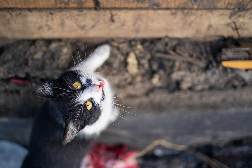 Egy fiatalember is hozzánk csapódik közben, ő megmutatja nekünk a megperzselődött disznót a patak mellett, az egyik oldalát már megdézsmálták a kutyák, a fekete-fehér macska is letép belőle egy falatot, ha már úgyis ott vagyunk. Szomorúan meséli, hogy megégett kutyakölyök is van, azt is megmutatja, ajánlja fel. Nem élünk a lehetőséggel, így helyette a még ép házak között indulunk el. Közben a saját kutyájáról is mesél, elvitték a menhelyesek, könnyesedik be a szeme, miközben képeket mutogat róla, arra esküdözik, hogy visszaszerzi majd.