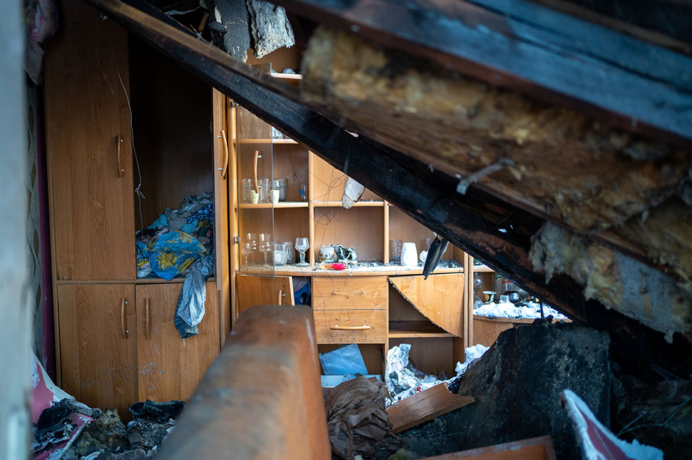 Az úttól balra eső rész csonkult: néhol csak a ház oldala ép, néhol egy-egy laskaszűrő, meregető kanál, megpergelődött karácsonyi dísz, néhol egy betonból készült alap árulkodik arról, hogy még pár hete az a földdarab valakinek az otthona volt. Néhol semmi: vagy elhordták a többiek vagy a hó temette be.