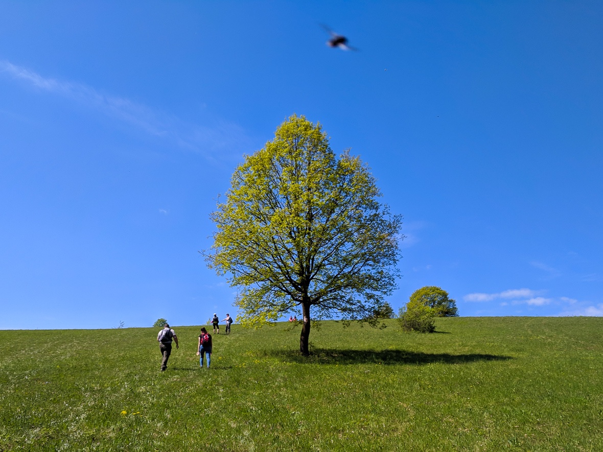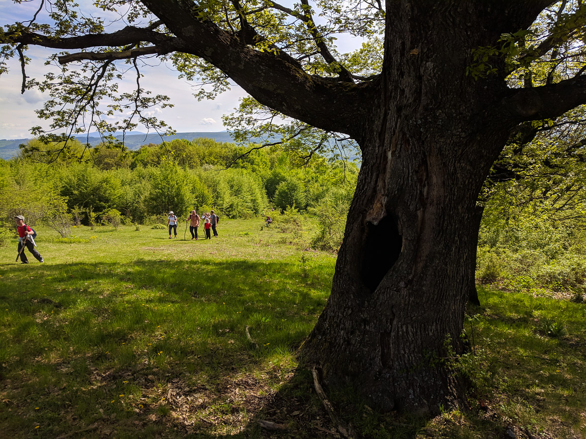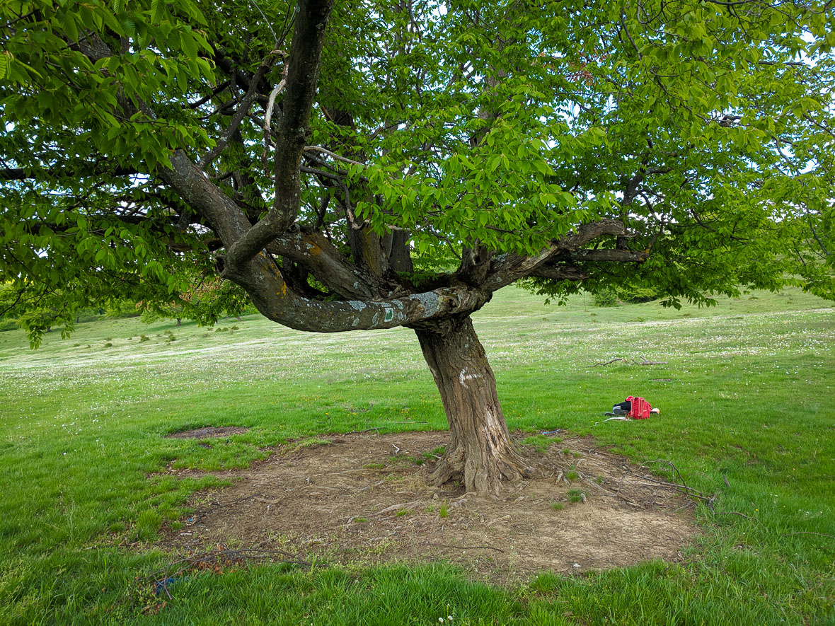 Egy nagyon izgalmas fa tövében valaki szunyál, csöves hátizsákkal a hátán, gumicsizmával a lábán. Vajon, pásztor-e vagy teljesítménytúrázó, gondolkodunk el, de nem merünk közelebb menni, nehogy megzavarjuk. Sok gyönyörű nagy és sok nem annyira nagy, de izgalmas sorsú fa van ezen a réten, a Budvár és a Csicser közti völgyet megkerülő úton. Érdemes ide kilátogatni, nekem mindig egy élmény.