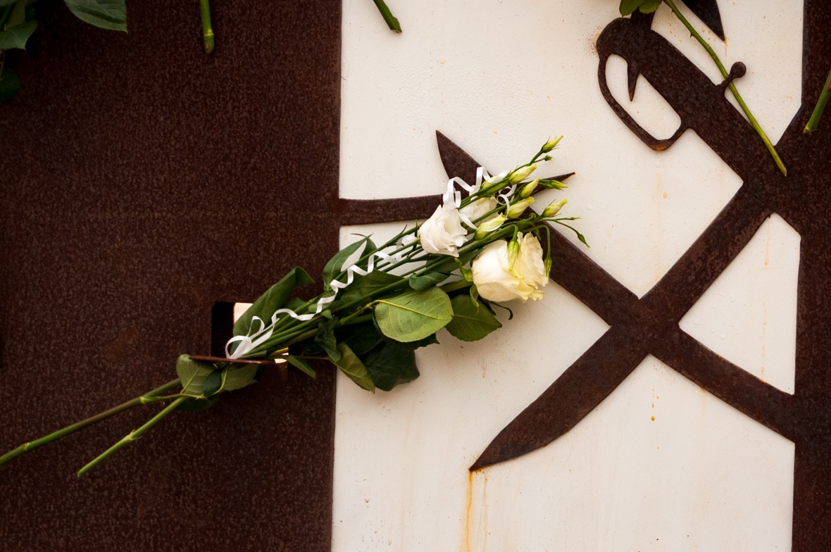 A vasból készült művet a 13-as szám határozza meg: elöl 13 szablyát ábrázol, hátul a 13 aradi vértanú nevét marták bele, és 13 lyukat vágtak, amibe 13 fehér rózsát szúrtak. – A művész olyan anyagot választott, amit az idő alakít: a nyers vasat a rozsda alakítja, és az esőtől olyan lesz, mintha a szablyáról vér csöpögne a fehér háttérre. Így válik időszakos mementóvá.