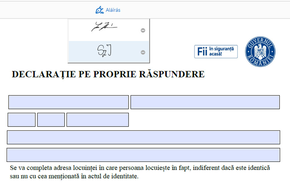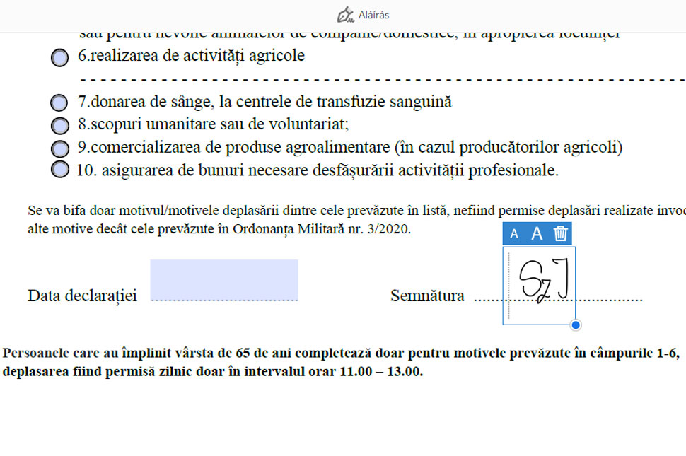 Habár az erre vonatkozó (3.) katonai rendelet csak annyit ír elő, hogy alá kell írni a nyilatkozatot, és digitálisan is be lehet mutatni, a Stratégiai Kommunikációs Csoport március 26-ai közleménye egy olyan instrukciót is tartalmaz, hogy kinyomtatva kell aláírni, ezért az általunk javasolt módszert csak saját felelősségre ajánljuk használni.