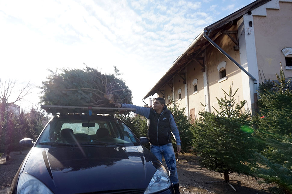 A körutat a Tompa László utcában kezdtük reggel, ahol az egész udvar kiörökzöldült. Itt csak Horvátországból importált normand fenyőket árulnak, 120-tól 250 lejig terjedő árban lehet őket megkapni, de a kereskedő elárulta, lehet egy kicsit lefaragni belőle – nem csak a fából, az árból is.