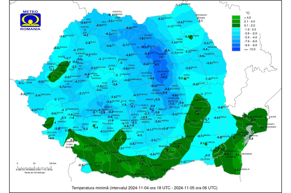Ovidiu Câmpean, a dél-erdélyi regionális meteorológiai állomás meteorológusa az Agerpresnek elmondta: Maroshévízen mínusz 8,8, Gyergyóalfaluban mínusz 8,5, a Bucsinon mínusz 5,4 fokot mértek.
