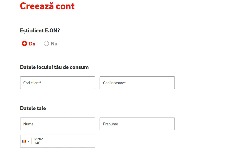 - Nem is kell a Da gombra kattints, ezt alapból kijelöli a rendszer. A postaládába érkező számlán keresd meg az ügyfélszámot (Cod client) és a fogyasztási pontot (Cod încasare), gépeld be őket. Alájuk jön majd a családnév (Nume) és a keresztnév (Prenume), utána a telefonszámod, de a kezdő nullát nem kell beírnod. Ha ez megvan, görgess lennebb.