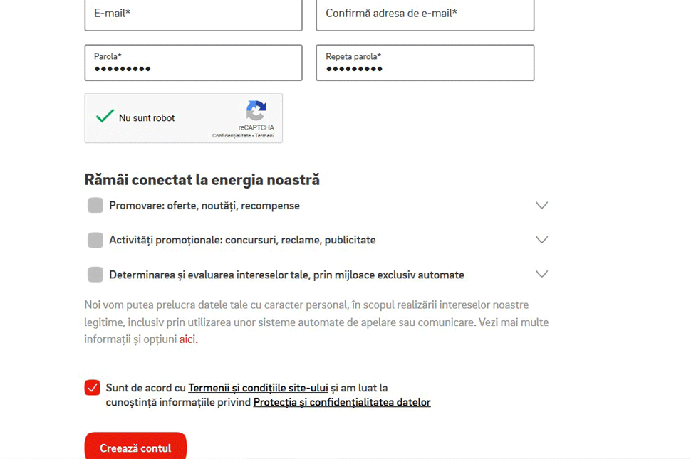A kitöltött mezők alatt egy kattintással pipáld ki az üres dobozt (Nu sunt robot). Ha nem kérsz promóciós emaileket az E.ON-tól, akkor csak az utolsó dobozkára kattints, és nyomd meg alatta a piros Creează contul gombot.