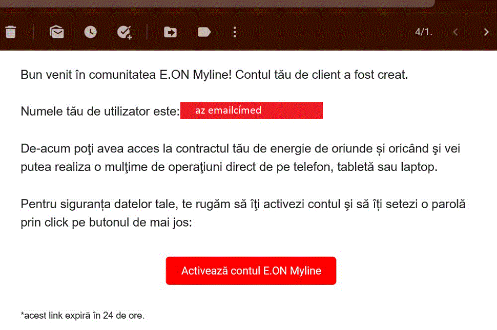 - Ha mindent jól csináltál, akkor kapni fogsz egy emailt. Nyitsd meg és kattints a regisztrációt megerősítő linkre (Activează...), ami visszavisz az E.ON oldalára.