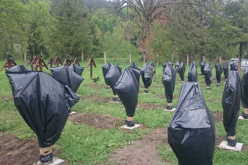Névtelen civilekből álló akciócsoport szemeteszsákokkal takarta le csütörtök délután az illegálisan felállított betonkereszteket az úzvölgyi temetőben.