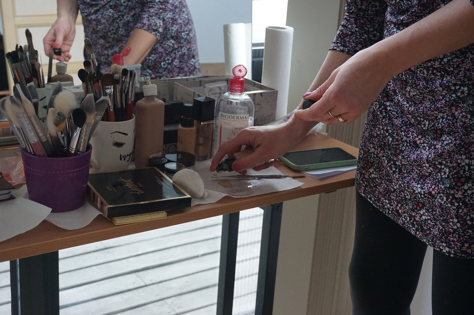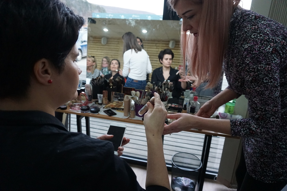A jelenlévő hölgyek azt sem bánják, ha épp nem ők ülnek a sminkekkel teli asztal melletti székeken, szorgosan osztják meg egymással kedvenc termékeiket, trükkjeiket, és közben figyelmesen csüngnek a két udvarhelyi kozmetikus szavain.
