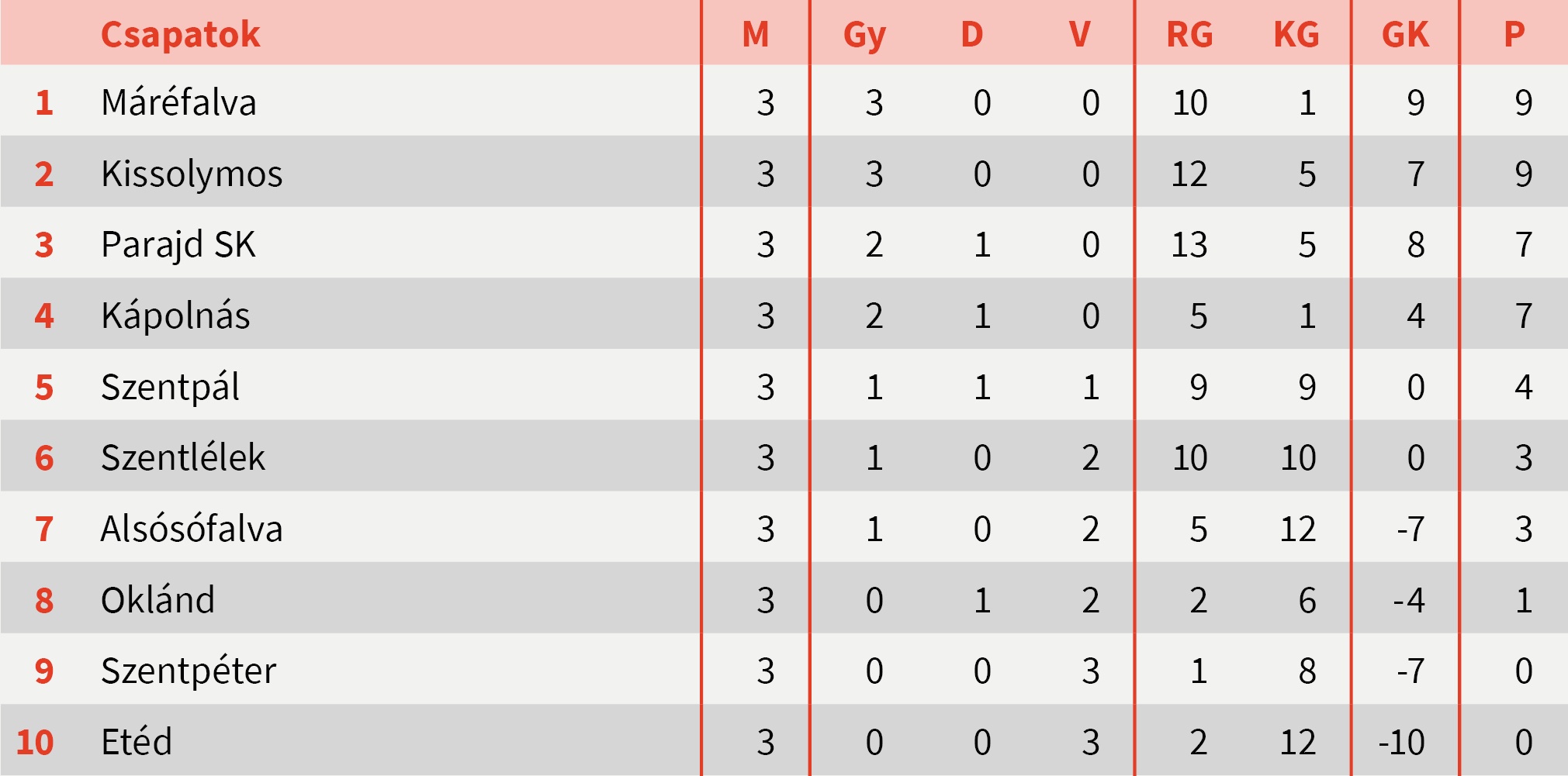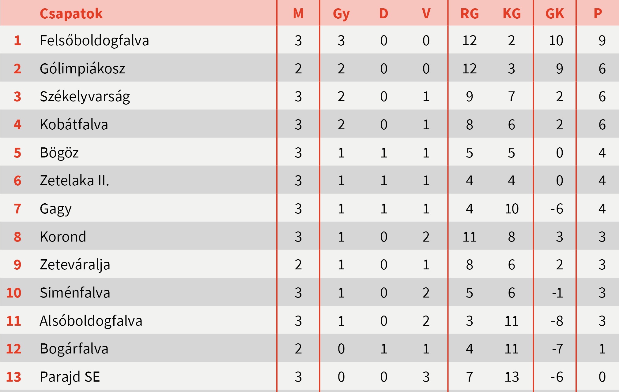 A 6. Ligában Máréfalva jobb gólarányának köszönhetően vezet Kissolymos előtt. A máréfalviak három forduló alatt tíz gólt szereztek és mindössze egyet kaptak. A dobogó harmadik fokán a Parajd SK áll, szorosan a nyomában Kápolnás követi.