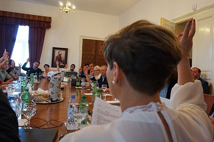 Arros Orsolya összegzi a javaslatokat. Az eredeti mellett kilencen, Derzsi változata mellett ugyancsak kilencen szavaztak. Készpénz mellett csak öten. Néhányan tartózkodnak, van aki nem tudja, mitévő legyen.