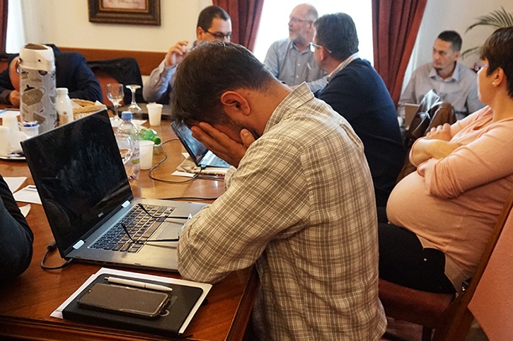 Mindenki ideges, a felterjesztő, aki több mint egy éve lobbizik, a leginkább. Három perc hangos szünet tanúi lehetünk, ezután Benedek Árpád Csaba jön a mentő javaslattal - úgy tűnik, ő érti leginkább a tanácsülések menetének szabályait - a rendes tanácsülés után azonnali tanácsülésen tegyék újra napirendre.