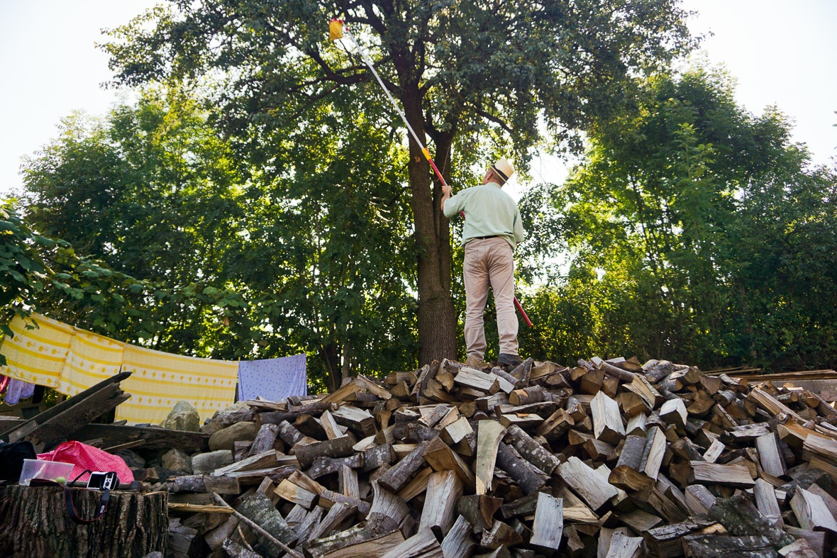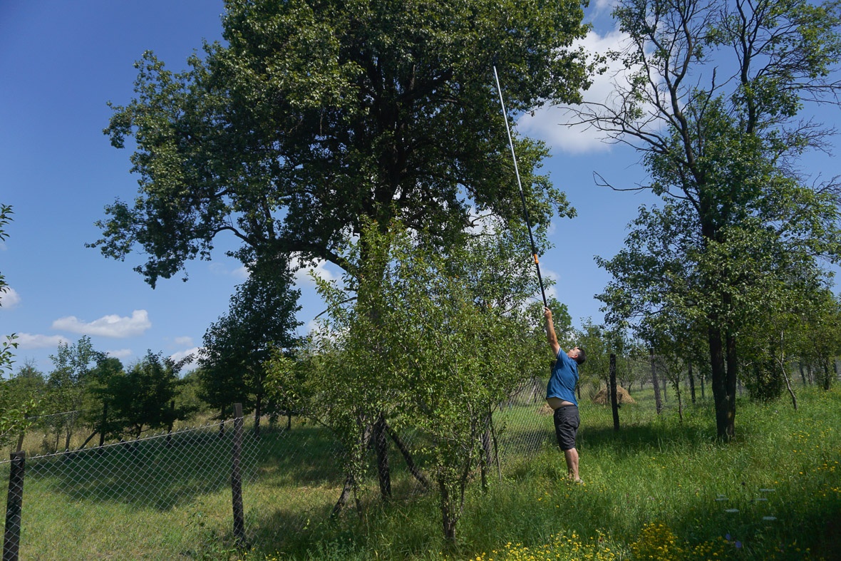 Szerencsére most nem kell vezérünknek átmásznia a kerítésen, mert kintről elérünk néhány gyümölcsöt. De alig-alig érjük el. Ez a fa nem vackorász-barát magatartásról tesz tanúbizonyságot. A legeslegalsó ágai is 6 méter magasan vannak, a 4 méteres ollóval lábujjhegyre kell állni, hogy valamit is le lehessen szedni róla.