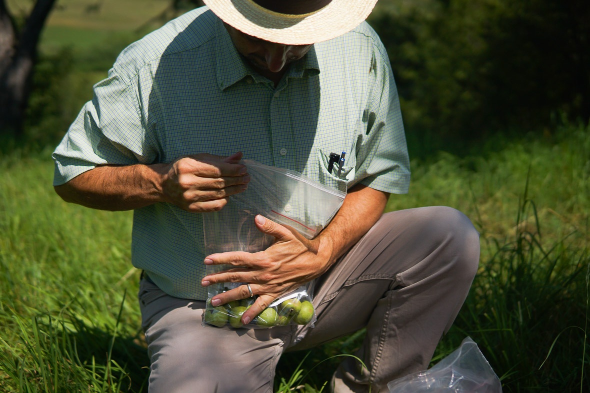 Így néz ki egy minta. Egy kisebb, légmentesen lezárható zacskóban a levelek, amik a gyümölccsel együtt bekerülnek egy nagy zacsiba. Ez már más vackor, időközben átkerültünk az Incze-kertbe, és egy olyan fáról gyűjtünk, amelyik a gazda, Jakab Mózes szerint Magról kelt vackor.