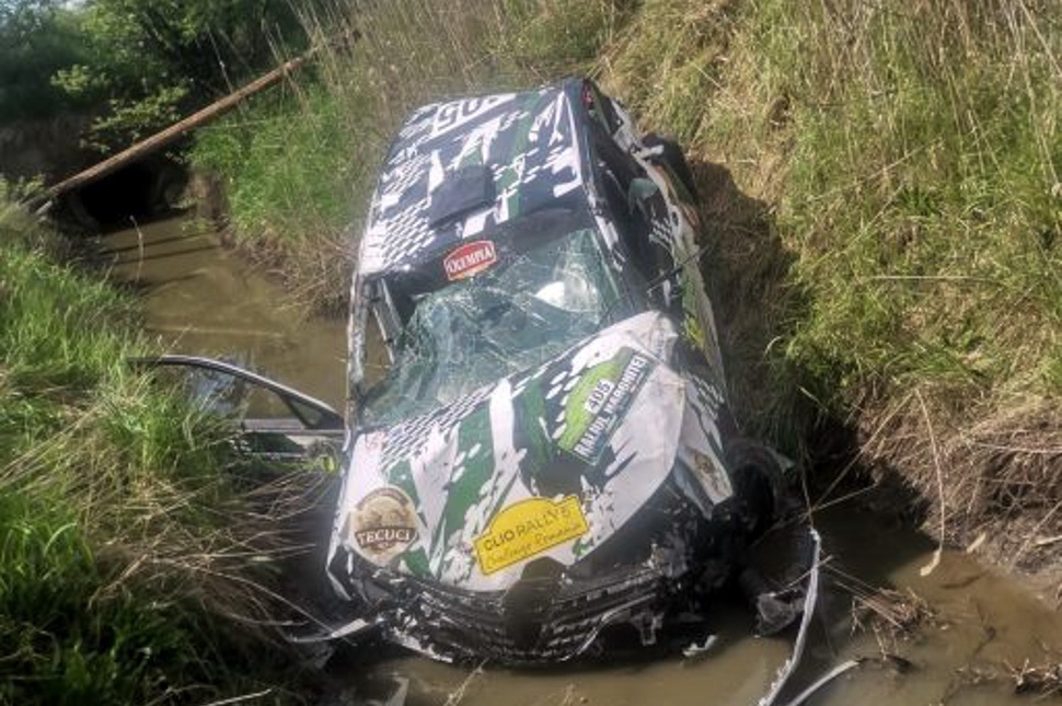 sajnos az idei Hargita Rally. A nyolcadik – szentpáli – gyorson a Reis Suliman és Rareș Badea alkotta csapat a Suliman által vezetett Renault Clióval a rajttól számított néhány száz méteren belül lesodródott az útról, a Hargita Rally weboldalán közzétett kép alapján csúnyán összetörve az autó orrát, és szélvédőjét.