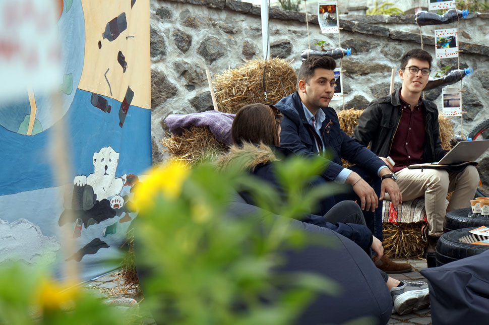 az apró malőrök ellenére nem mindennapi, egyszerű és nagyszerű. A tér központi részére felállított főhadiszálláson rongyszőnyeggel bevont szalmabálákra ültetnek, autógumiból és flakonokból összetákolt asztalkán kínálják az ehető csészéből iható kávét. A hangulatot és a koncepciót tovább erősítik a sátor oldalaira felakasztott PET-palackok, amelyekbe epret ültettek. „Hátha péntekig kibújik, piacolhatunk egyet” – jegyzi meg nevetve Tornai Szilárd alelnök.