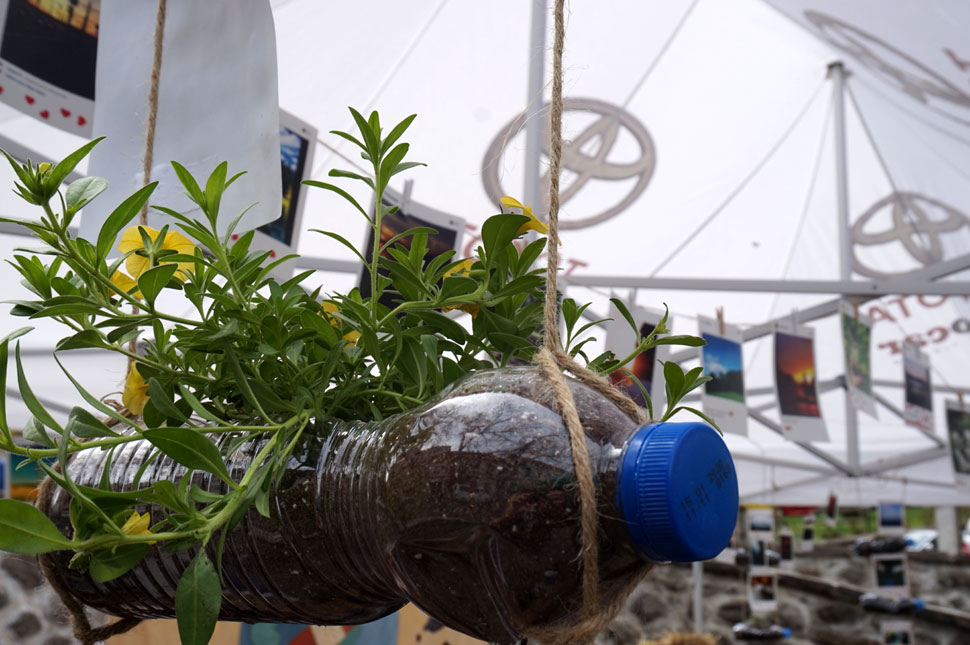A fejünk fölött instafotókból álló füzérek csüngenek, ezek évekkel ezelőtt készültek egy kampány során, és a természethez köthető alkotásokból válogattak. Arra is ügyeltek, hogy a szórólapok újrahasznosított papírból készüljenek, és a roll-up molinók is használhatóak maradjanak a rendezvény után.